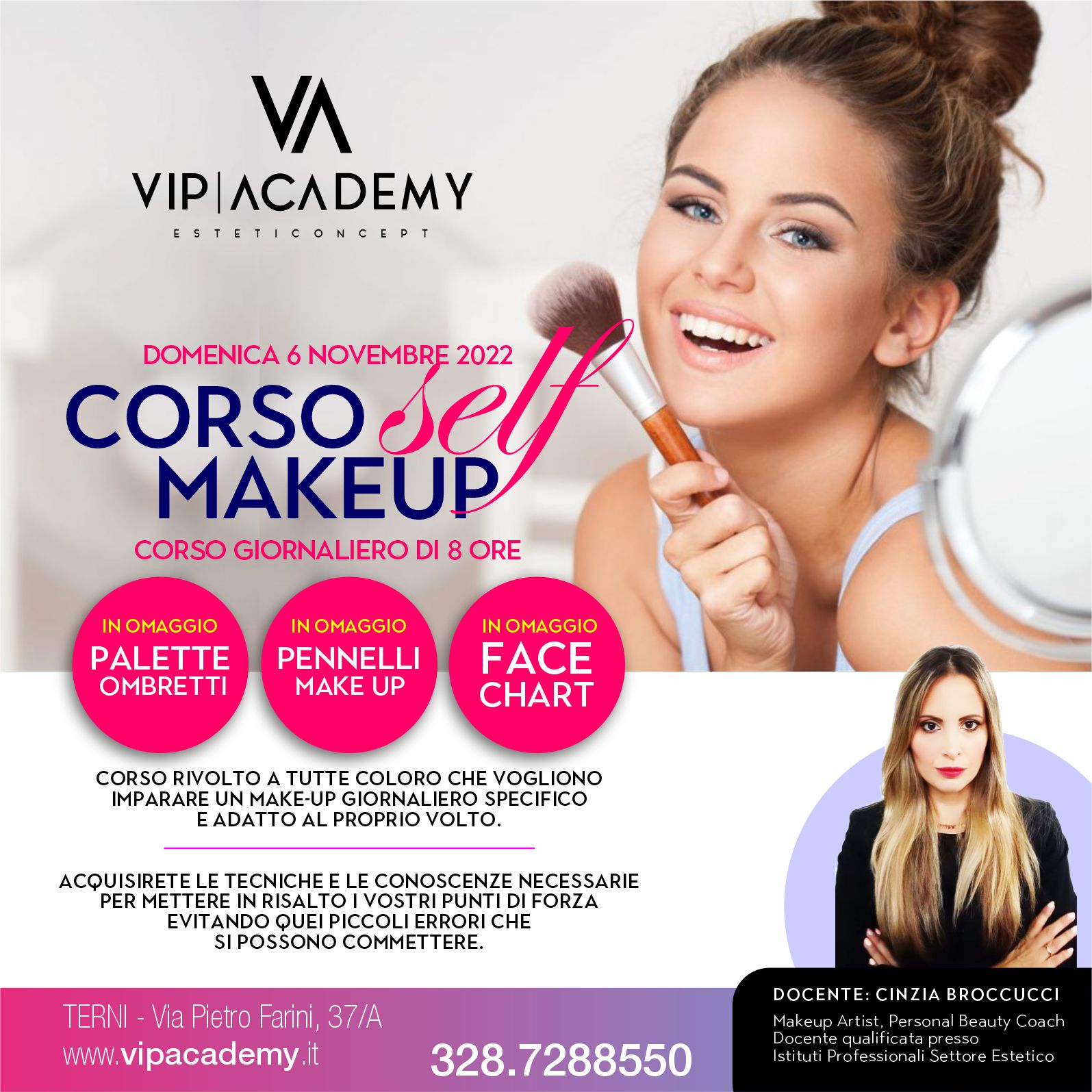 Tutta l’esperienza della nostra insegnante sarà messa a disposizione delle corsiste per analizzare insieme la propria struttura del volto, lo stile, i colori e creare un make up perfetto.